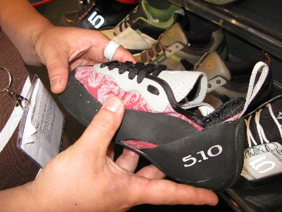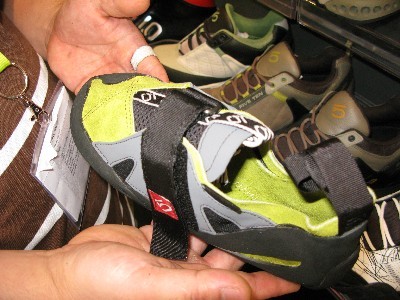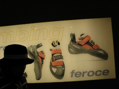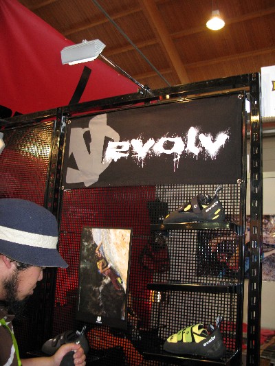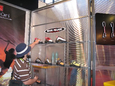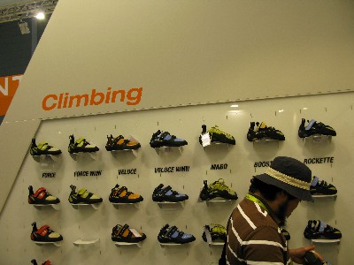 ブース入り口にはクライミングシューズと登山靴が左右に振り分けられて展示されていてクライミングシューズにかける意気込みを感じました。