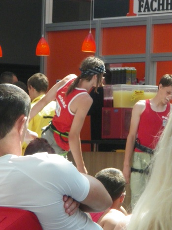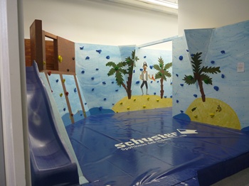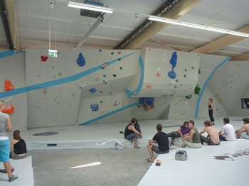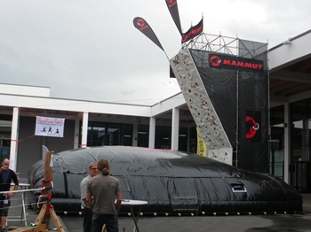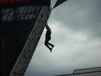 中庭にあったマムートの壁。ちゃっかり登ります。が、高さにビビりクライムダウンしようとしたら『jump!!!』コール。。。