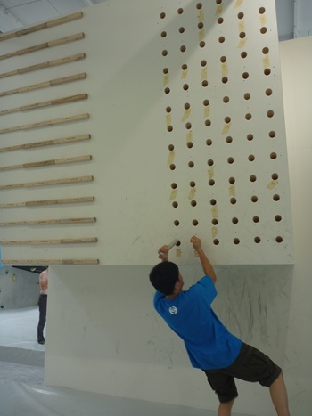 穴にナンバーがふってあり、順に棒をさして登っていくトレーニング。