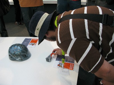 しっかり台に固定されているので手には取れませんがここで気になるギアをチェックしいざブースへ進むと効率がよいようです。