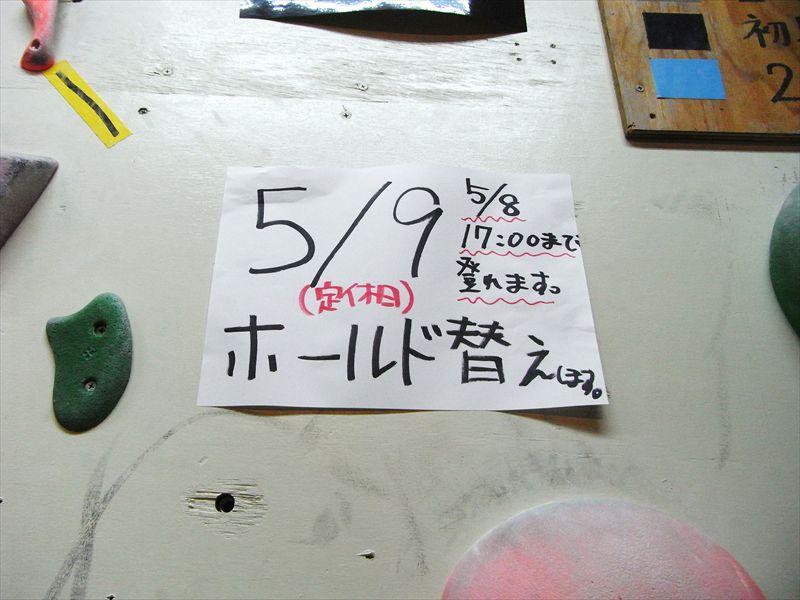 明日5/9に100°壁のホールド替えをします!!