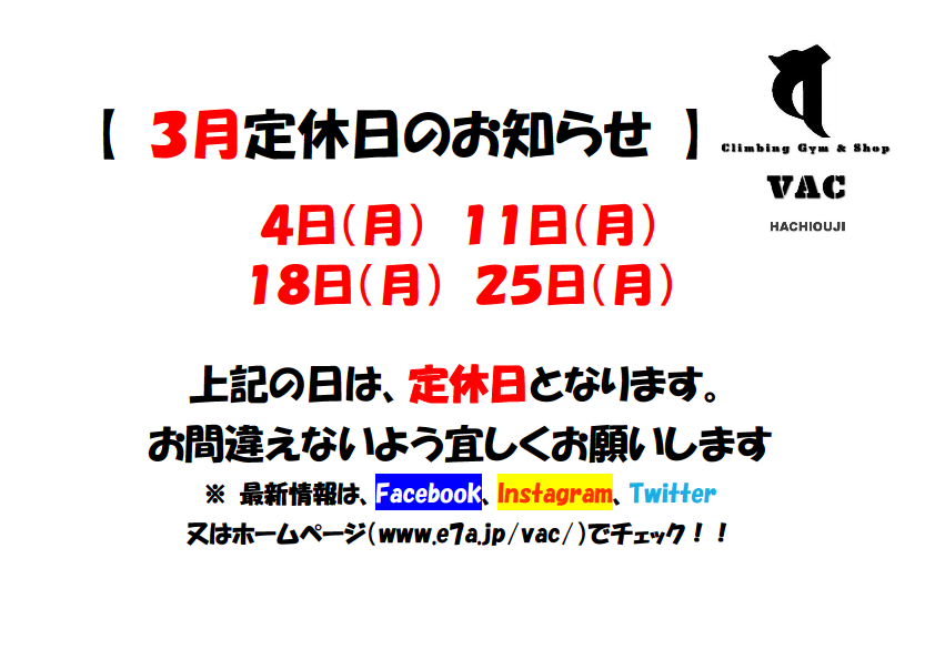 下記の日は、ルートセットの為、定休日及び営業時間変更となります。