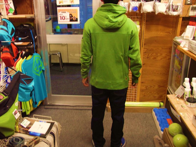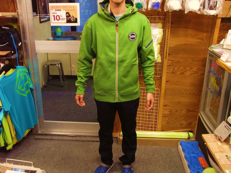 あざやかな緑色で着心地いいパーカーです。